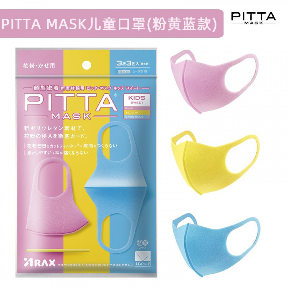 商品名称:日本 PITTA MASK儿童口罩(粉黄蓝款) 适用3-13岁儿童